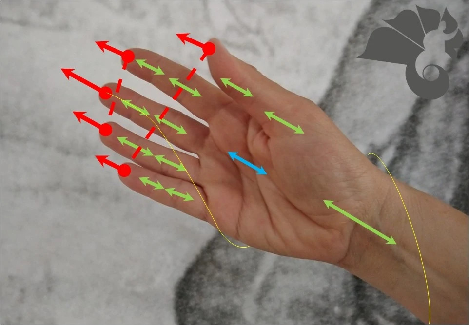 Die beiden Hände stehen in einer feinen Gewichtung zueinander: etwa 40 % yin und 60 % yang, stets wechselnd und einander ergänzend. Die Handflächen sind leicht gewölbt wie Dachziegel; Daumen und kleiner Finger halten eine innere Verbindung, während die Intention hauptsächlich auf Daumen, Zeigefinger und Mittelfinger ruht.